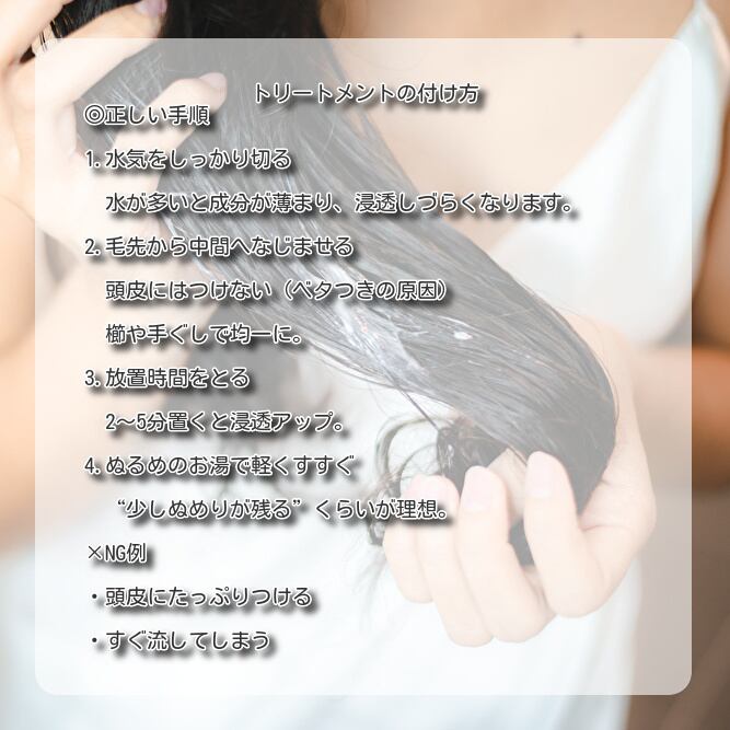 毎日のケアとしてお使いいただけます。シャンプー後に毛先を中心になじませ、数分置いてから洗い流してください。